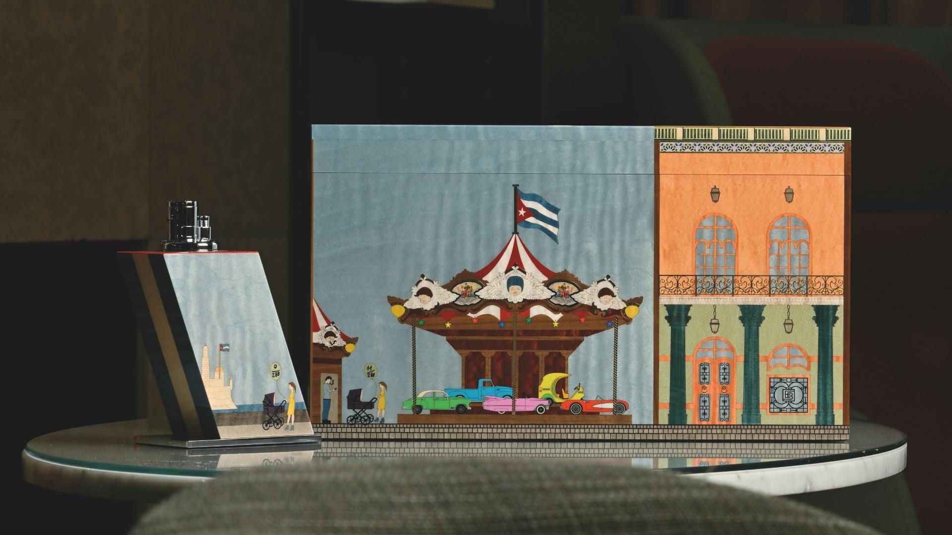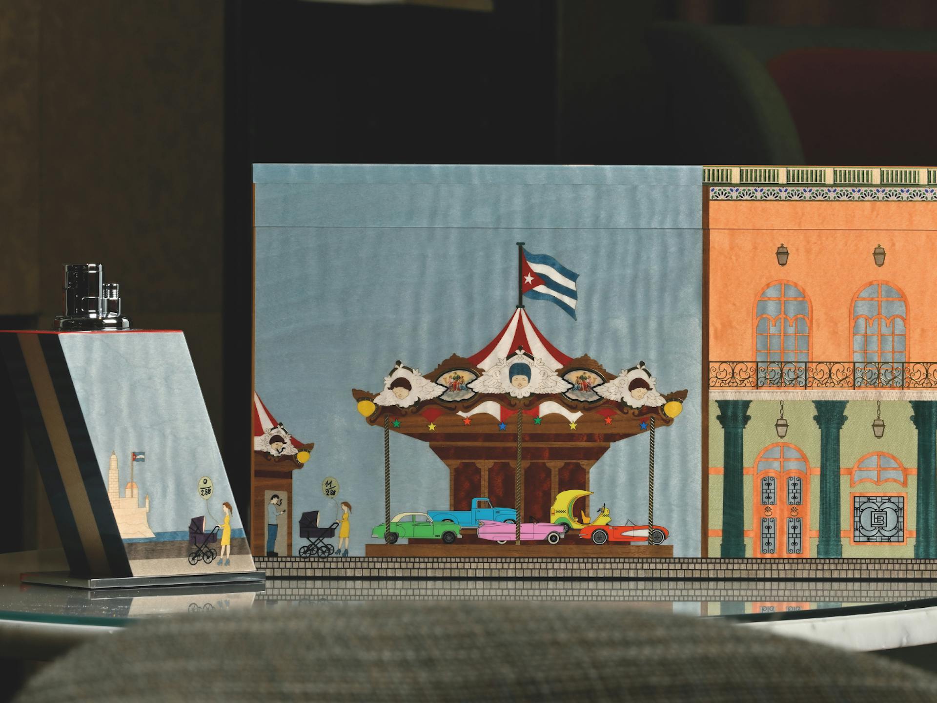 It all starts with meticulously chosen timber, carefully planed, adjusted, sanded, decorated, lacquered, polished, and lined. But the journey begins much earlier, sourcing rare local and exotic woods worldwide, prized for their extraordinary grains and veining. From these exceptionally fine veneers, individual motifs for El Carrousel are delicately cut, assembled, and carefully glued piece by piece, gradually revealing the intricate design. Each box, a true jewel of craftsmanship, is delicately embellished with luxurious materials such as mother-of-pearl and gold leaf, enhancing the brilliance of their patterns.