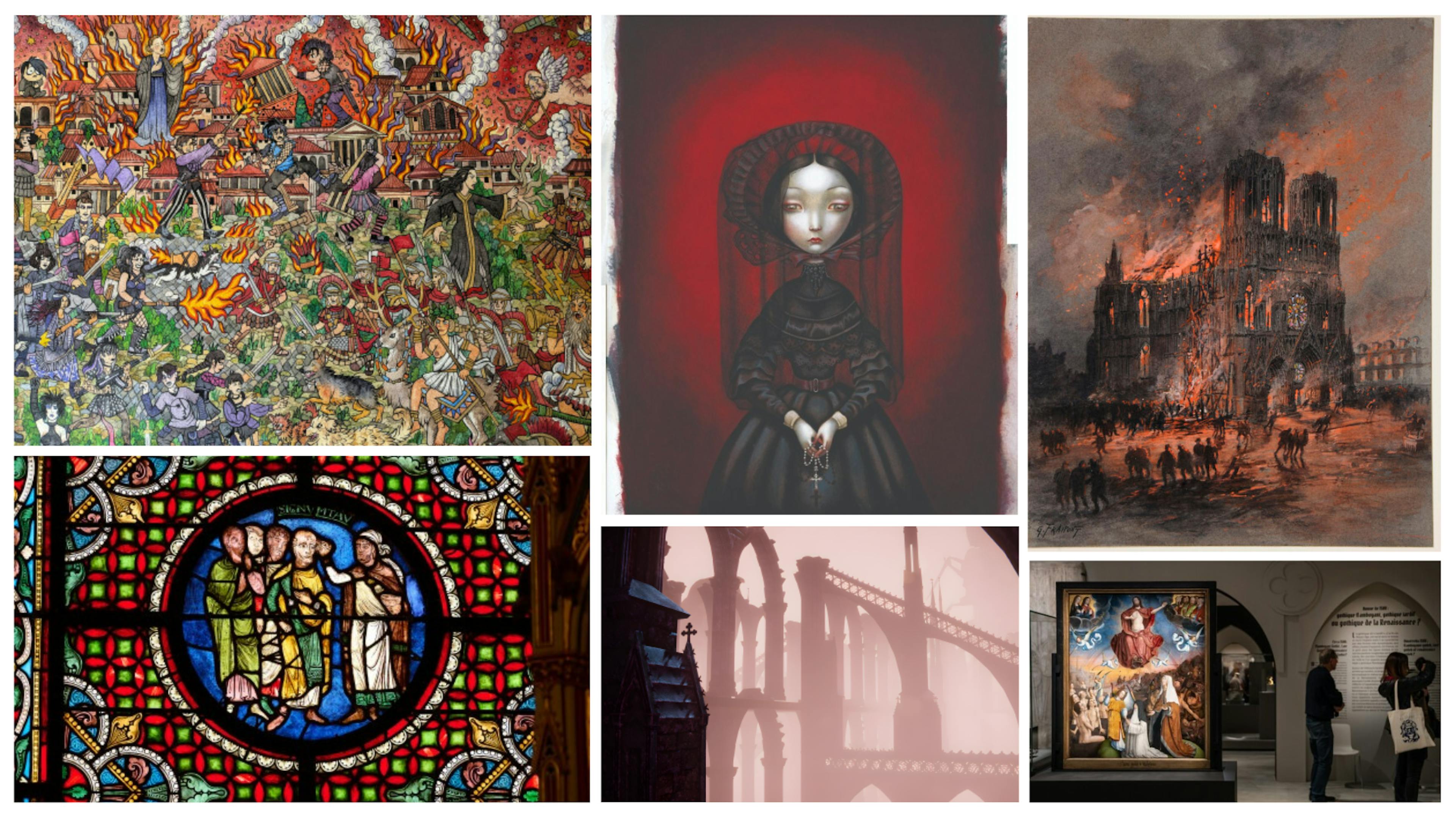 © Agathe Pitié, Le sac de Rom par les Goths, 2025 - © Panneau de vitrail, le signe du Tau Benjamin Gavaudo - Centre des monuments nationaux - © Benjamin Lacombe, La Veuve Les contes macabres, 2009, gouache et huile, Galerie Daniel Maghen - © Mélanie Courtinat, Ten Lands, 2020, jeu vidéo 3D réalisé via le moteur Unity ADAGP, Paris, 2025 - © Gustave Fraipont, Incendie de la cathédrale de Reims, 1914, encre et lavis sur papier vélin, Reims, musée des Beaux-Arts GrandPalaisRmn - © Exposition Gothiques - Louvre-Lens, F lovino