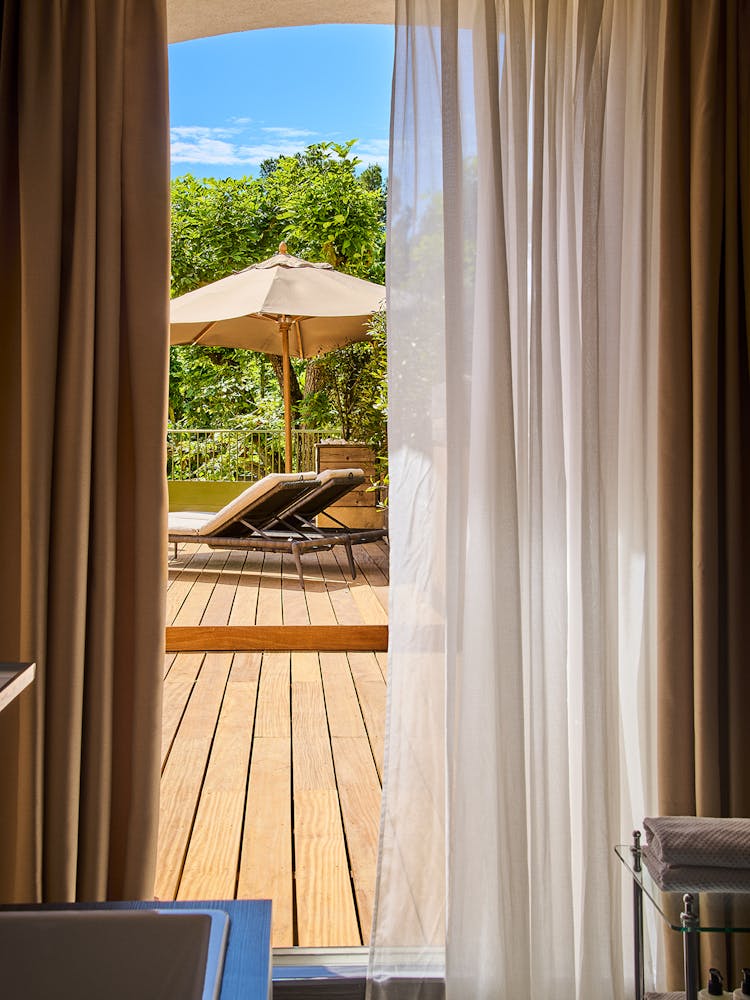 A spacious suite with a terrace, offering a panoramic view of the gardens of Le Pigonnet and the majestic Sainte-Victoire, or of those of Yellow Villa 1726.
