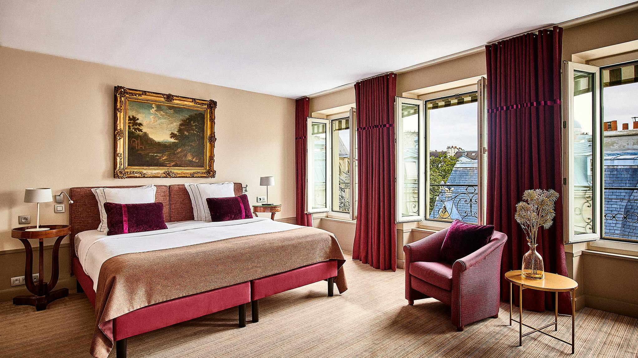 With a generous surface area ranging from 290-365 ft. sq., Deluxe rooms offer you a precious, quiet space in the center of the City of Light. Art is everywhere you look. Whether antique furniture, fabrics signed by famous brands Dedar, Elitis and Rubelli, original paintings, or authentic lithographs, you’ll be enveloped in French art de vivre.