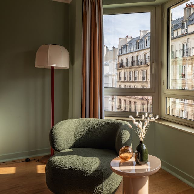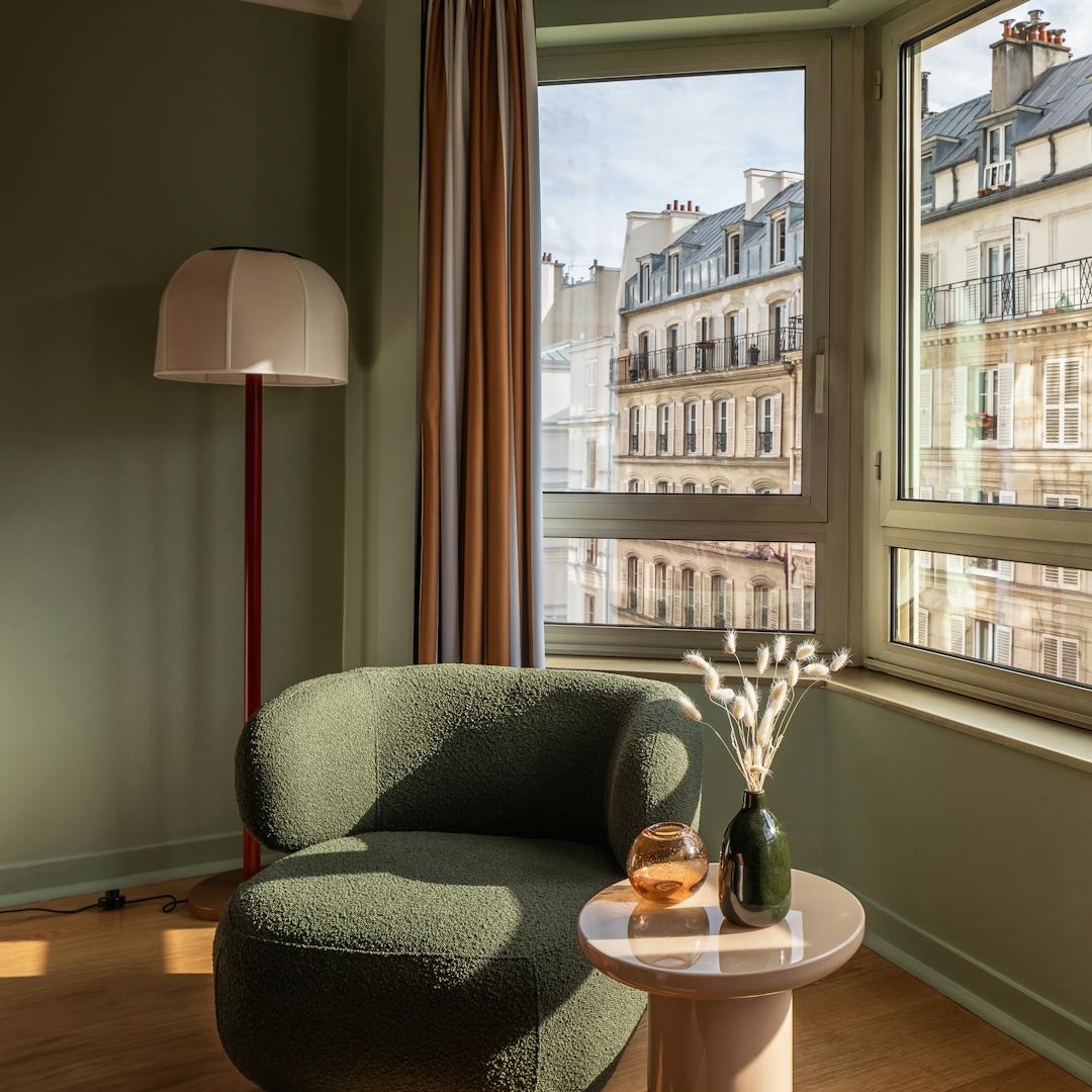 Derrière sa façade, 72 chambres, suites et appartements spacieux. Certains s’ouvrent sur un balcon, d’autres offrent une vue dégagée sur Paris et la Tour Eiffel. Les intérieurs jouent l’harmonie des teintes douces, des lignes simples et d’une décoration apaisante.
