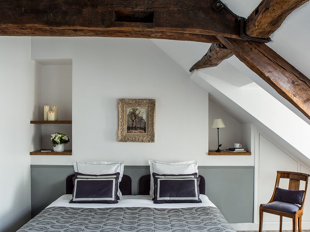 Au-dessus de vos têtes, les poutres en chêne du plafond mansardé sont les témoins d'une esthétique parisienne typique et chaleureuse.