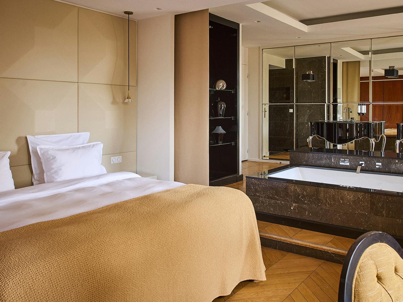 Bienvenue dans votre Suite Terrasse - Vue Jardin de 75 m² à l'atmosphère spacieuse et résolument contemporaine. Alors que le soleil joue à cache-cache dans les arbres centenaires, vous profitez d'une lumière douce depuis votre lit King size, transformable en lits jumeaux sur simple demande.