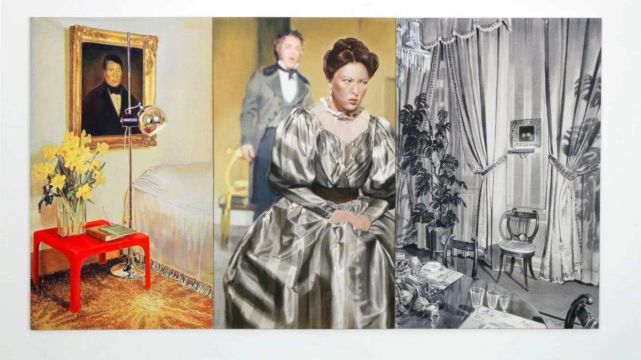 Triptyque Onéguine, 2006, huile sur toile, 195 x 374 cm, collection FRAC Nouvelle Aquitaine MÉCA © Nina Childress, adagp 2024, photo: Philippe Chancel