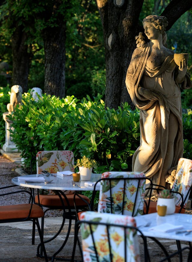 Nichée au cœur d'un luxuriant parc de deux hectares alternant entre jardins à la française et fontaines, cette bastide aixoise déploie un écrin de calme et de verdure propice à une expérience culinaire d'exception. La terrasse ombragée sur les jardins constitue l'un des atouts majeurs de cette adresse, offrant un cadre prestigieux unique dans le paysage gastronomique aixois.